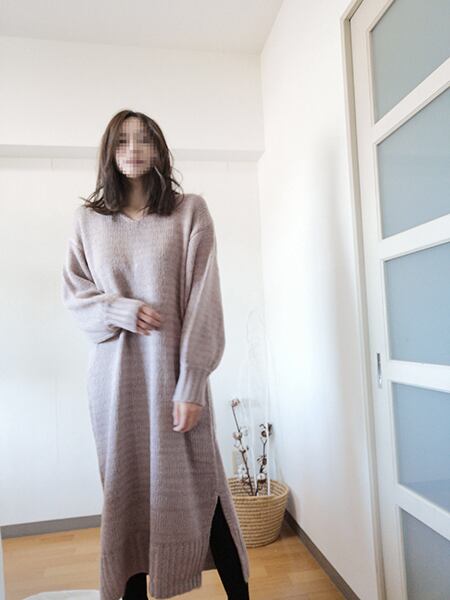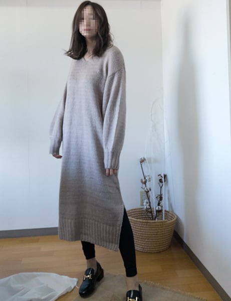 少し大きめの網目のロングニットワンピースで、両サイドにスリットが入っているので歩きやすいデザインです。
