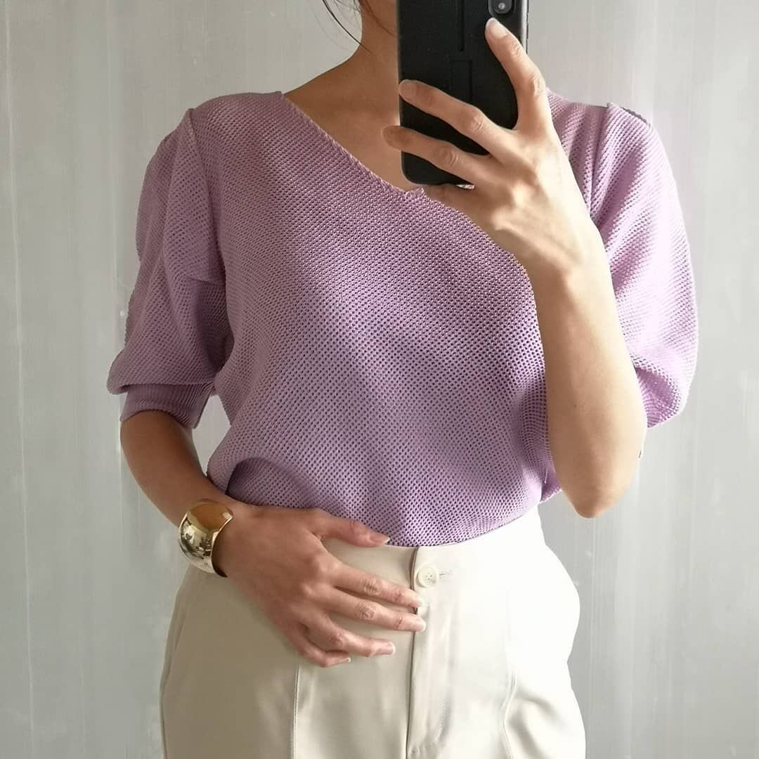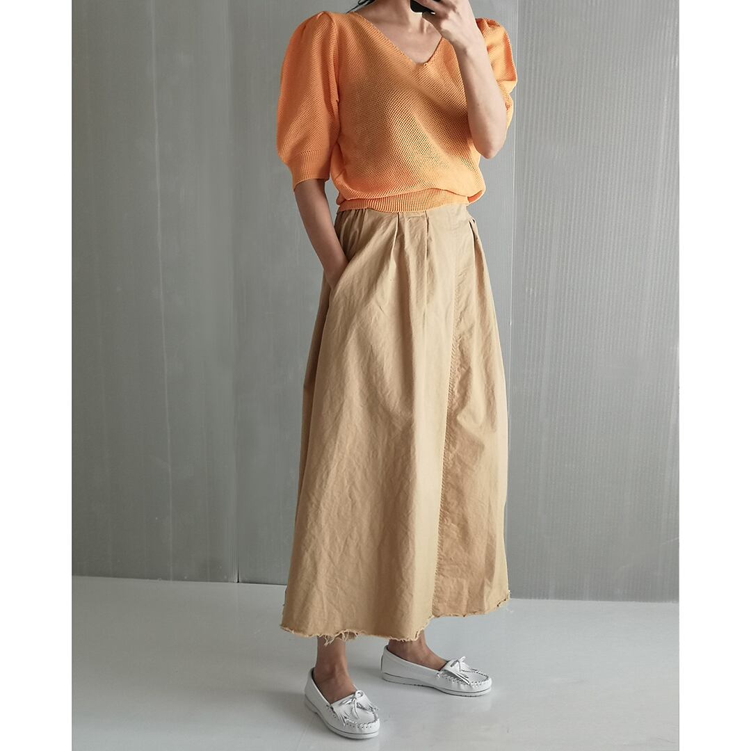パフそでとショート丈でフェミニンな印象の半袖ニットです。