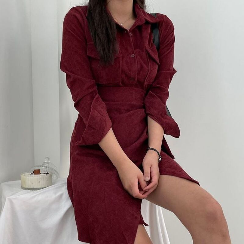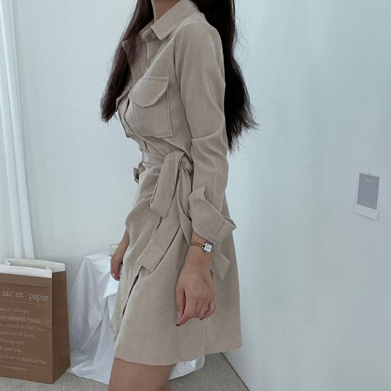 長袖 コーデュロイストラップウエスト ワンピース 2色